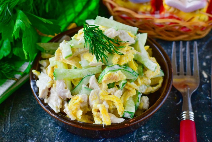 Салат «Геніальний» виходить досить гарним на вигляд, саме тому його сміливо можна подати навіть на святковий стіл. Для його приготування використовується куряча грудка, яку потрібно попередньо відварити. Також в салат додається свіжий огірок, завдяки якому готова страва виходить соковитою.