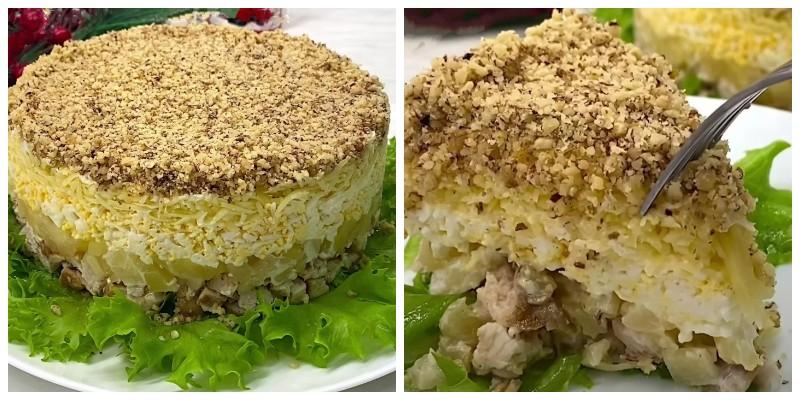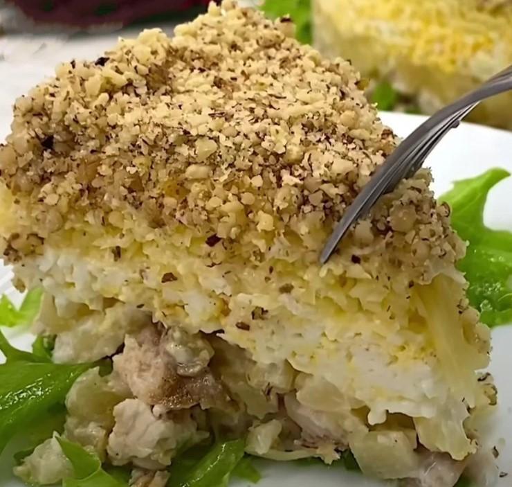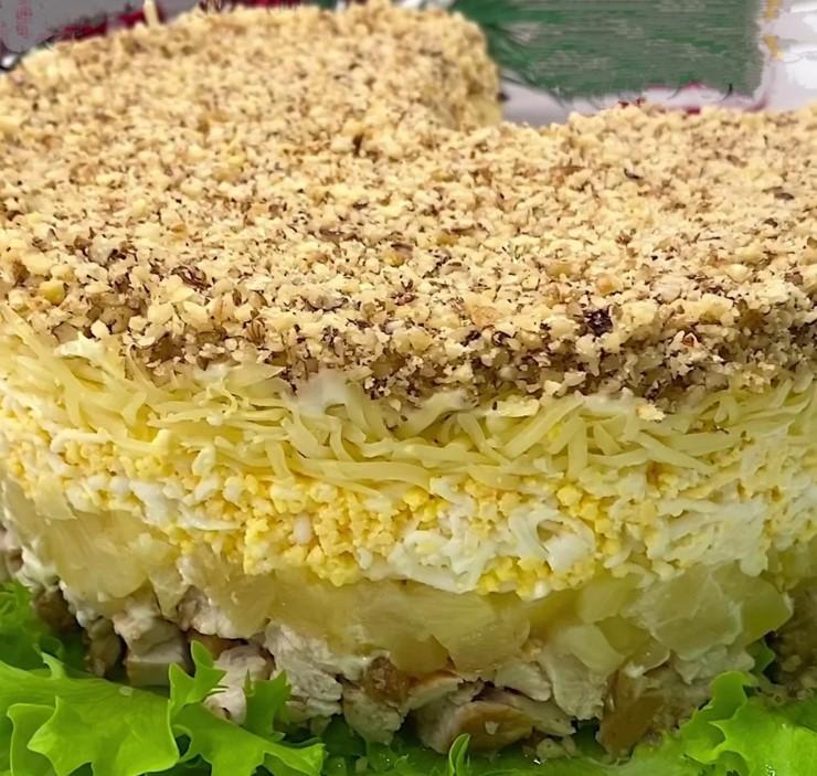 Салат цікавий своїм незвичним поєднанням продуктів. Обсмажена куряча грудка + ананаси — саме той випадок, коли “дивно” на словах, але дуже смачно на практиці.